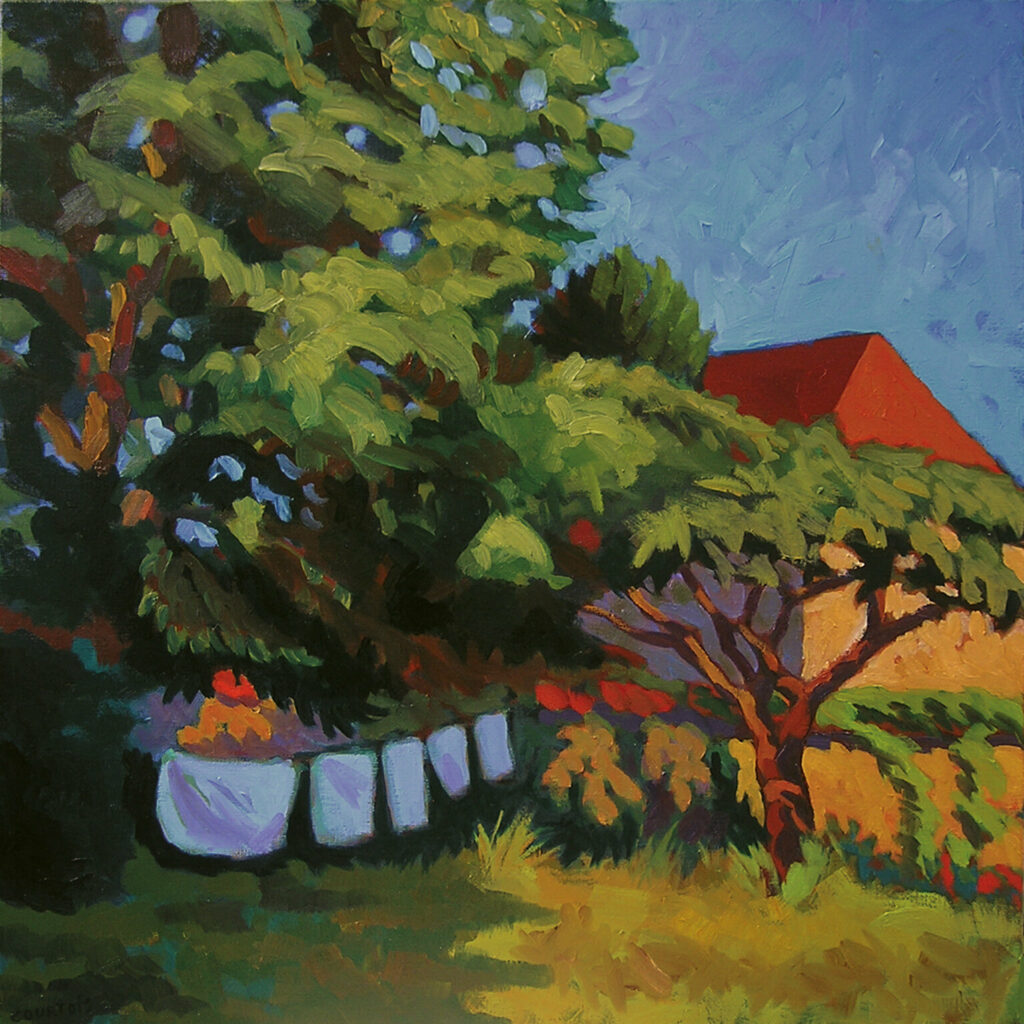 In einem mit Obstbäumen bestandenen Garten, sind zwei Frauen damit beschäftigt, Wäschestücke zum Bleichen auf dem Gras auszubreiten. Im Bildvordergrund steht ein hölzernen Zuber, aus dem ein Tuch heraushängt. Weiter hinten zupft eine zweite Frau die Ecken eines Wäschestücks zurecht, während ihre andere Hand bereits nach dem nächsten greift. Rechts im Hintergrund ist zwischen Obstbäumen ein gepflegtes, aus Ziegeln gemauertes Haus sichtbar, vor dem einige Hühner im Gras herumpicken. In der Tiefe des Gartens, wo sich die Bäume zu einer grünen Wand verdichten, halten zwei Frauen über einen Holzzaun hinweg ein Schwätzchen. Ganz links im Gras sitzt eine weitere Frau mit dem Rücken an einen Baum gelehnt. Sie ist offenbar mit einer diffizilen Arbeit beschäftigt. Die Kronen der Bäume überspannen mit ihrem satten Grün die gesamte Szenerie und lassen ein gleichmäßiges, helles Licht auf das Gras, die Wäschestücke und die Frauen fallen.