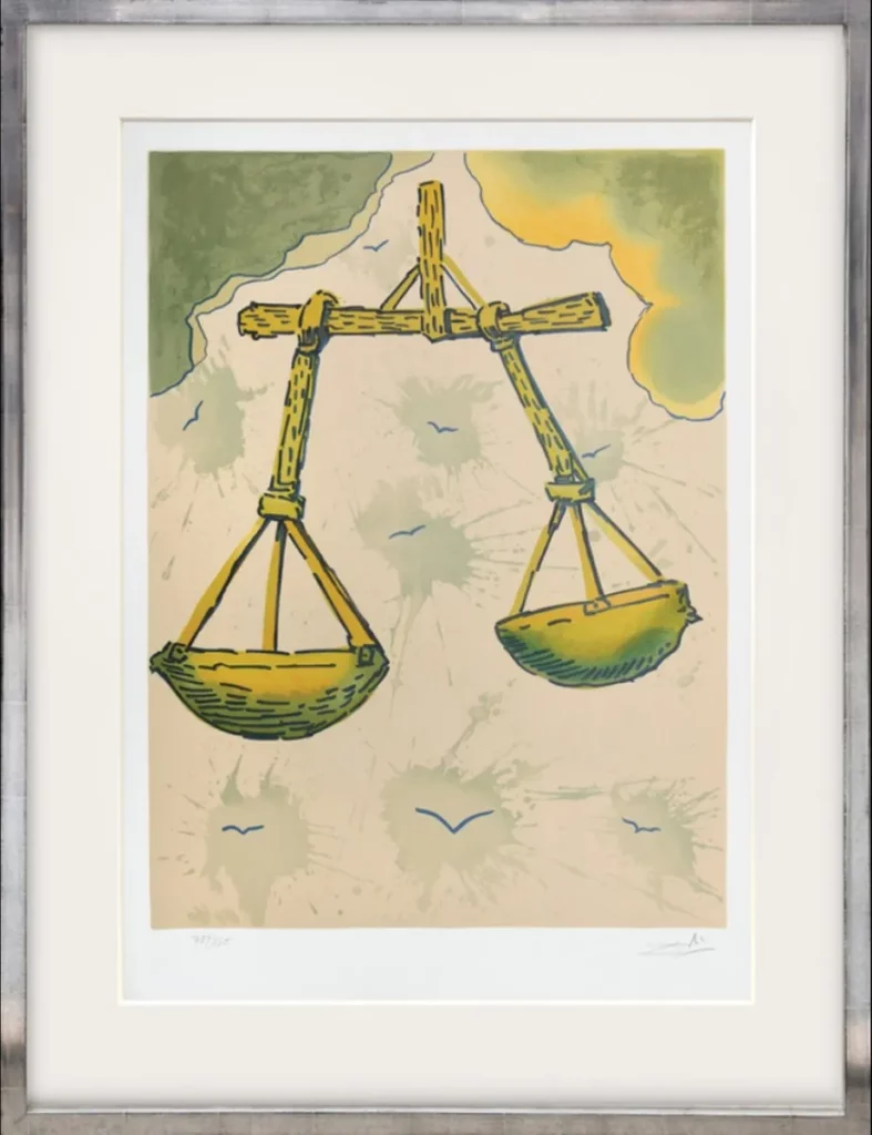 Salvador Dalí schuf 1967 das Gemälde „Waage“. Es ist Teil seiner Serie astrologischer Zeichen und zeigt Dalís charakteristischen surrealistischen Stil.