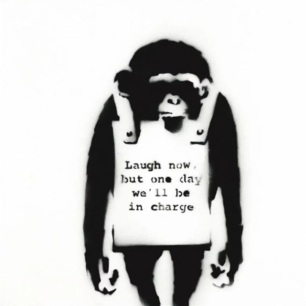 Laugh Now, Cry Later“ zeigt einen Affen, der ein Schild mit genau diesem Text trägt. Das Leben ist eine Achterbahnfahrt und manchmal muss man die Fahrt einfach genießen. Egal, ob Sie Lust auf Lachen oder Tränen haben, Banksy-Gemälde bieten Ihnen das Richtige.