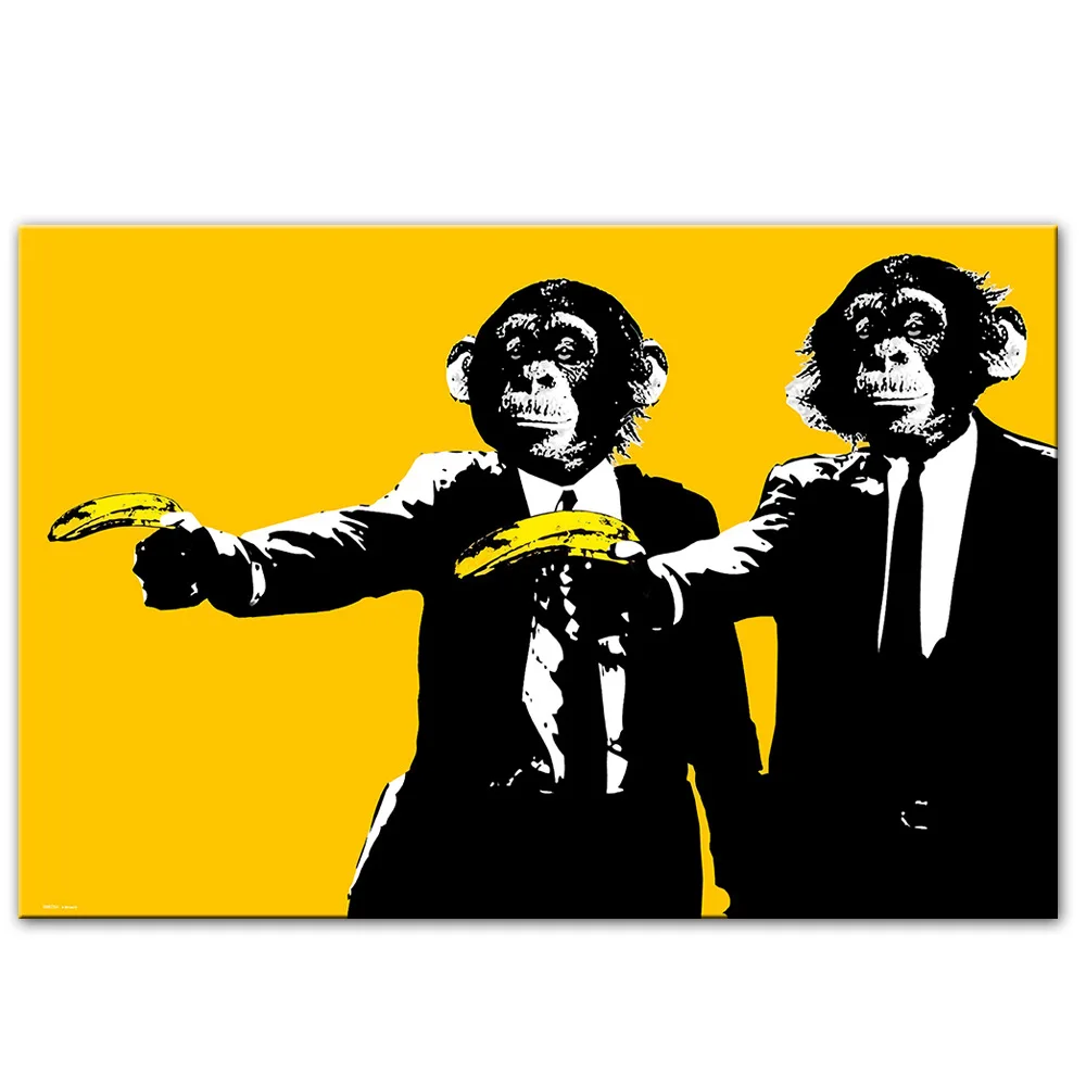 Pulp Fiction Schimpansen ist eine zum Brüllen komische Interpretation des ikonischen Filmplakats von „Pulp Fiction“, aber mit Schimpansen im Mittelpunkt. Das ist Banksys Art zu sagen: „Wir sind nicht so entwickelt, wie wir denken.“ Dieses Stück wird sicherlich Ihre Lachmuskeln kitzeln.