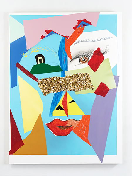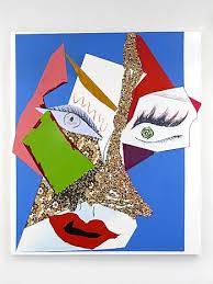 Thomas verwendet Collage, Acrylfarbe, Emaille, Strasssteine und ihre eigenen Bilder als Grundlage für ihre Gemälde.