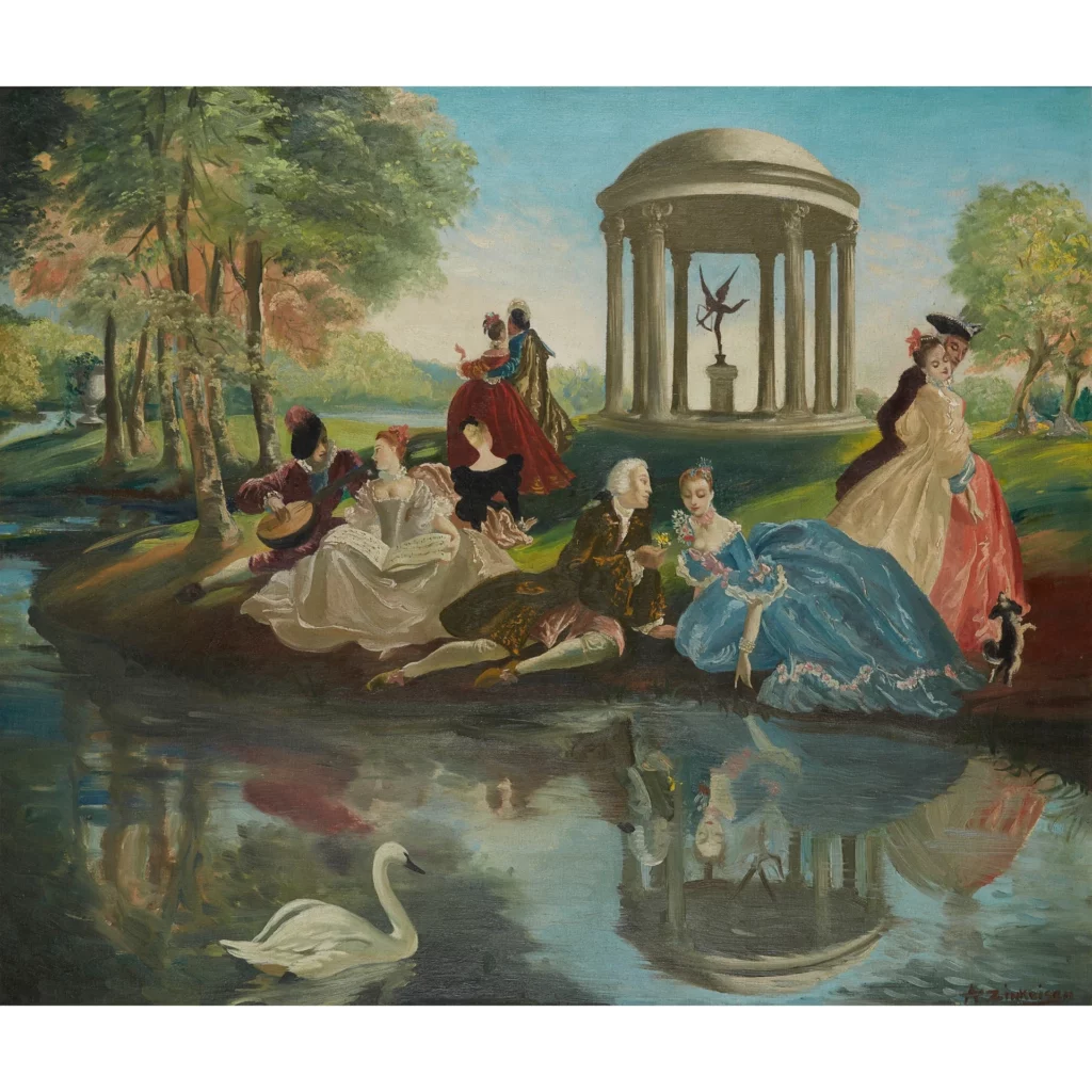 Dieses Gemälde ist eine Momentaufnahme des lebendigen Chaos des Lebens, ein Zeugnis von Zinkeisens Fähigkeit, die Essenz der Heiterkeit einzufangen und in ein zeitloses visuelles Fest zu übersetzen.