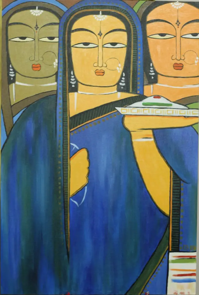 Three Pujarins isn’t just a painting; it’s an experience. Roy’s strokes, intentional and bold, guide your eyes through the canvas, inviting you to dance with the women lost in devotion. The simplicity is deceptive – it’s a portal to a world where every line, every color, tells a story.