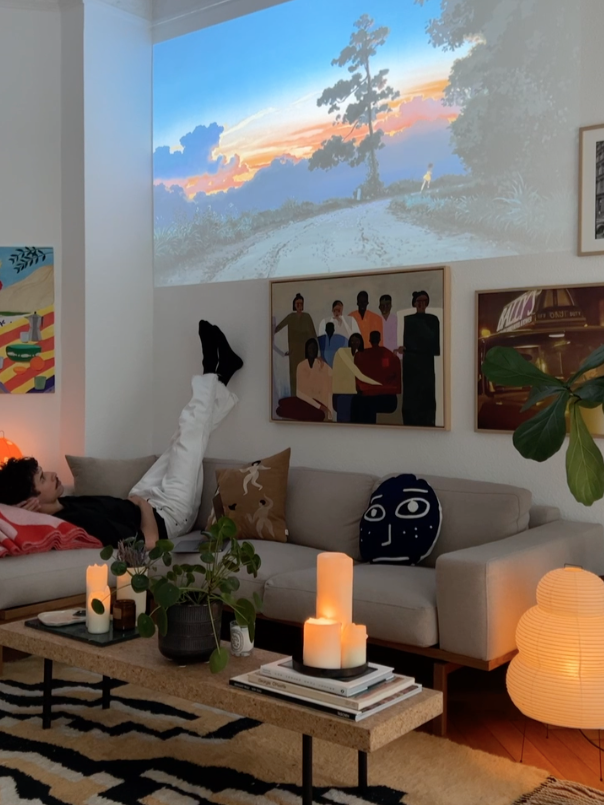 My living room is my space to unwind, to relax, to read, to dance and to watch movies on a projector. There is also a balcony with lots of plants, a wooden floor and a view into green trees. In my loft room, I have a long table by Objekte Unserer Tage, a Berlin-based furniture designer. It is the centerpiece of this room. I love cooking and hosting dinner parties.
