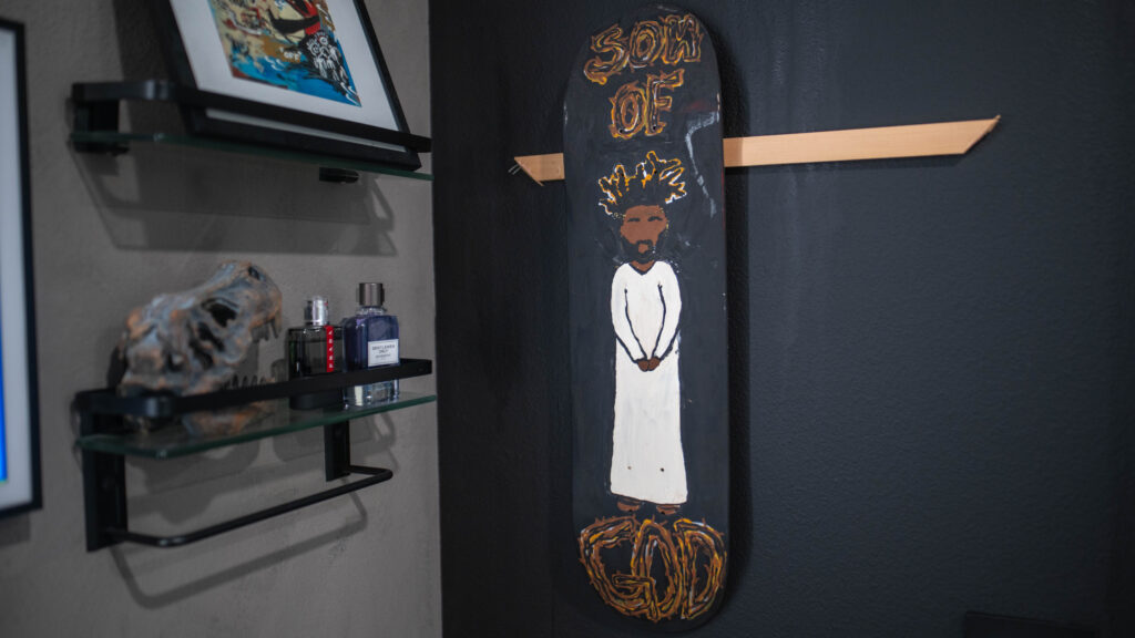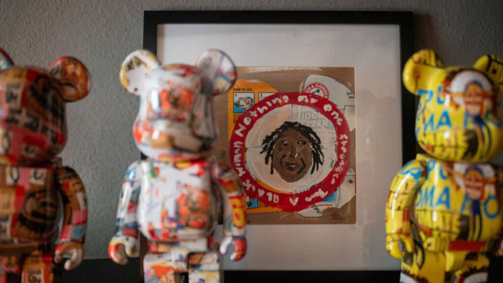I’m not entirely sure why I feel such a strong connection to this particular painting, but it’s my own rendition of Basquiat’s Walking with Death. I originally created it in my previous home, and now in my current residence, I have a larger canvas stretching across the entire living room wall featuring four versions of it. It’s a piece that resonates with me deeply, despite not fully understanding why. It’s as if Basquiat’s presence is walking alongside me in my everyday life.