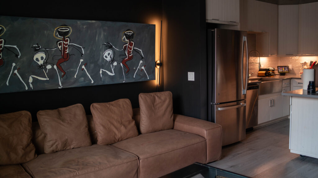 In designing my home, I aim for the same level of refinement as I do with my culinary creations. Even if I’m recreating something as ubiquitous as a McDonald’s Big Mac, I strive to elevate it. Similarly, with furniture choices, I wanted an elevated aesthetic while maintaining comfort. Take, for instance, the couch in my living room, positioned beneath my Walking with Death painting. This painting depicts a skeleton and exudes a cool, stark vibe against the black wall. To complement it, I opted for a low-to-the-ground couch made of brown leather, resembling the texture of a horse or cow. The contrast between the painting and the couch creates a visually striking yet harmonious connection that just felt right to me.