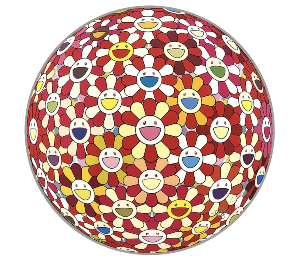 “Flowerball: Takashi Murakami’s Vermilion ” is available on Singulart. It is a vivid and moving piece, featuring the artist’s flower motif together with traditional Japanese signs of good fortune and longevity.