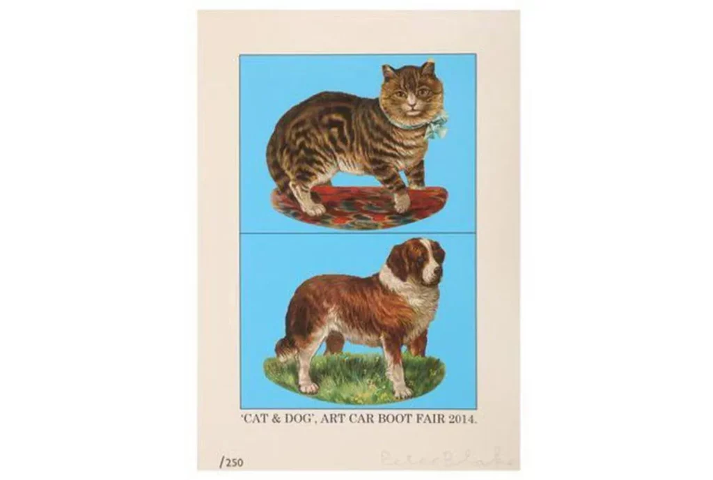 ‘Cat and Dog’ is another artwork by Peter Blake which is available on Singulart. In this artwork, the artist depicts the animals in a pop art manner using his bright palette and cheerful style. The piece is in line with his other works that focus on subjects derived from everyday life and popular culture.