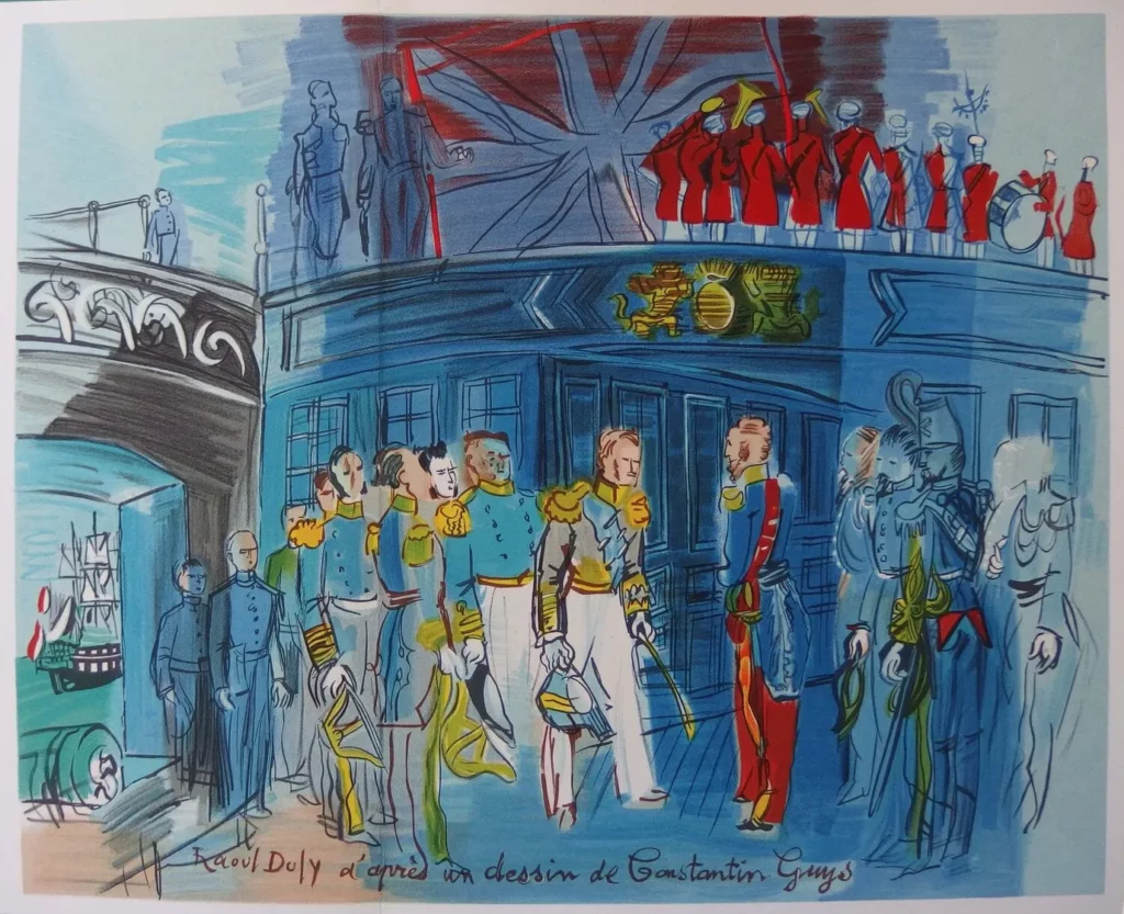 La carrière artistique de Raoul Dufy a pris racine dans les rues venteuses du Havre. Né dans une famille modeste, Dufy a montré son talent naturel en rejoignant les cours du soir à l’École des Beaux-Arts, où la flamme de sa grande carrière a commencé à brûler. Son parcours artistique allait de la touche impressionniste aux couleurs vives du fauvisme et à la combinaison du cubisme et de l’abstraction. Cette transformation symbolisait plus qu’une simple évolution artistique, mais aussi le dévoilement d’un siècle qui fut à la fois scène de stabilité et de chaos.