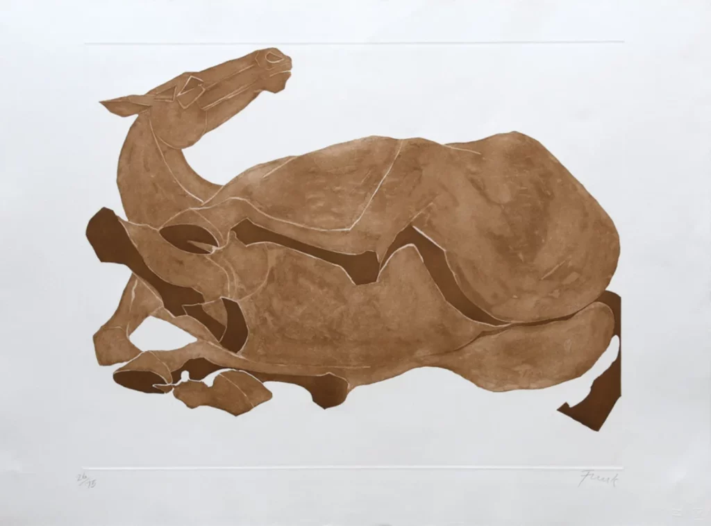 « Cheval Renversé » par Elisabeth Frink est disponible sur Singulart. Ici, elle infuse des scènes quotidiennes avec des éléments inattendus, montrant sa diversité. Cette œuvre met en évidence ses efforts pour mêler humour et surprise dans son art.