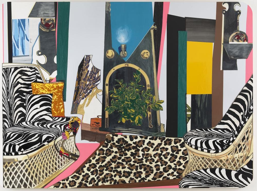 Fête des Motifs : Vous avez déjà été à une fête où tout le monde porte des motifs fous, mais ça fonctionne ? C’est ce qui se passe ici avec le tapis zèbre et la fourrure funky. Mickalene transforme les motifs en une danse.