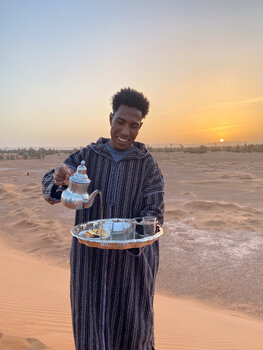 In dieser eindrucksvollen Szene habe ich die Essenz von Wärme und Gastfreundschaft vor dem Hintergrund eines ruhigen Sonnenuntergangs in der Wüste eingefangen. Das aufrichtige Lächeln des Motivs und die traditionelle Geste des Tee-Servierens verkörpern eine einladende Stimmung. Der leuchtende Horizont und die sanften Sandtöne bilden eine harmonische Mischung und laden den Betrachter ein, einen Moment der Ruhe und des kulturellen Reichtums zu genießen.… Dieses Stück strahlt eine Energie aus, die jedem Raum die Schönheit eines ruhigen Abends verleiht.