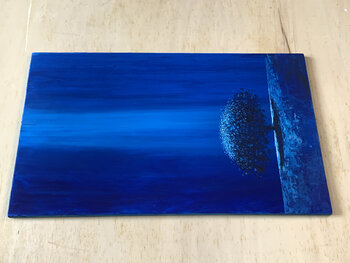 TOUCHED BY THE BLUE ist ein mit Acrylfarben auf Holz gemaltes Gemälde, nicht gerahmt, aber fertig zum Aufhängen. Es gehört zu der Serie, die Bäumen und der Natur gewidmet ist. Bäume auf diese einzigartige und originelle Weise darzustellen, kam mir vor einigen Jahren in den Sinn und ist für mich eine Art, die Natur zu feiern. Der Lichtstrahl kann als Zeichen der Hoffnung gesehen werden, dass das Zeigen auf den Baum in einer bedrohten Welt fast wie… ein entfernter Weg zur Erlösung erscheint. Der einsame, erleuchtete Baum, der allein wie ein Schauspieler auf der Bühne steht, erinnert fast an die menschliche Verfassung und führt zur Meditation und zu einem Gefühl der Ruhe und Schönheit voller Pathos.