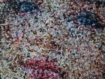 Es ist eine Collage aus Acrylfarben und vielen kleinen Zetteln, auf denen man hier und da verstreute Wörter und Sätze lesen kann.