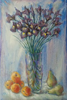 In diesem Gemälde habe ich versucht, das lebendige und doch subtile Zusammenspiel von Licht und Textur durch die ausdrucksstarke Sprache von Öl auf Leinwand einzufangen. Die Schwertlilien, deren Strich voller Emotionen ist, brechen in einem Tanz aus Purpur- und Blautönen hervor und symbolisieren Leidenschaft und Tiefe. Die verstreuten Früchte, die in ihrem eigenen rustikalen Charme schwelgen, verleihen einen Hauch geerdeter Ruhe. Dieses Kunstwerk… ist eine Feier der vergänglichen Schönheit des Lebens und soll jedem Raum, den es schmückt, einen Hauch von Inspiration und einen Spritzer Farbe verleihen.