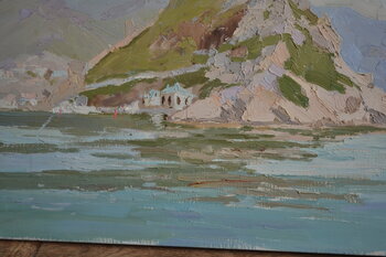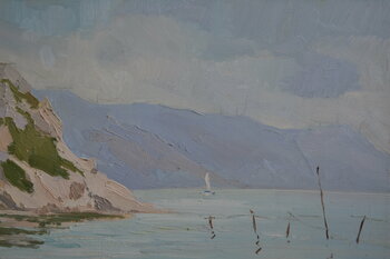 In meiner Kreation habe ich Öle verwendet, um das ruhige Zusammenspiel von Licht und Natur einzufangen und ein Gefühl der Ruhe und Kontemplation zu vermitteln. Die geschickten Pinselstriche verbinden Minimalismus und Impressionismus und erwecken die flüchtige Stimmung einer Küstenszene mit einem Berg, der die Seele verankert. Dieses Stück verkörpert die stille Kraft der Natur und soll jeden Raum mit Ruhe und einem Hauch von Fernweh erfüllen.