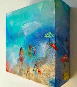 Die Reihe "Strandleben" ist eine sehr besondere Arbeit von mir. Das wunderschöne Motiv eines Strandtages wird variiert und verschiedene Szenen dargestellt. Spektakulär und ungewöhnlich ist dabei der Bildträger. Auf der 7,5 cm dicken Leinwand eintsteht ein einzigariger Eindruck von Dreidimensionalität. Auf dieser hochwertigen handwerklich bespannten und grundierten Leinwand wird das Motiv von allen Seiten beleuchtet, sogar von unten und oben. Echter… Sand sorgt für Struktur und pastose Ölfarbe lässt die Figuren dreidimensionl wirken. Von jeder Seite erschließt sich dem Betrachter eine völlig andere Ansicht. Es tummeln sich Segler, Schwimmer, spielende Kinder, Familien, Angler, Stand Up Paddler und alle anderen Arten von Sonnenfreunden um die Leichtigkeit und Freude dieses Tages am Wasser zu genießen. Dieses Werk wirkt in jedem Raum und ist absolut ungewöhnlich sowohl einzeln, als auch in der Serie.