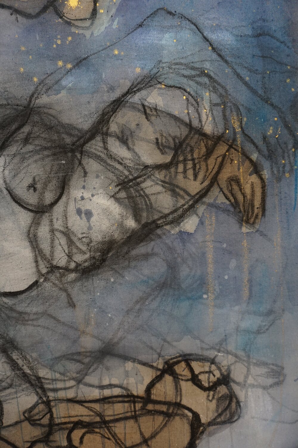 Der Untern Sternenzelt I Under the Starry Sky- Dieses Gemälde ist in seiner Vielschichtigkeit und Poesie ein Erlebnis. Über 30 Frauenfiguren in unterschiedlichen Posen sind auf der abstrakten, in Blautönen lasierten Bildfäche arrangiert. . Die Hauptfiguren sind deutlich erkennbarr während andere Figuren unscharf bleiben, was sehr geheimnisvoll wirkt und einen bewegten Endruck schafft und gleichsam eine Geschichte in den Hintergrund legt. Die Figuren… schlafen und träumen an diesem Ort unter den Sternen, die sich wie ein Schutz über Ihnen ausbreitet und über sie wachet. Das Werk lässt viele Interpretationsmöglichkeiten zu. Durch den Auftrag der Farbe auf ungrundiertes, braunes Leinengwewebe höchster Qualität entsteht eine grosse