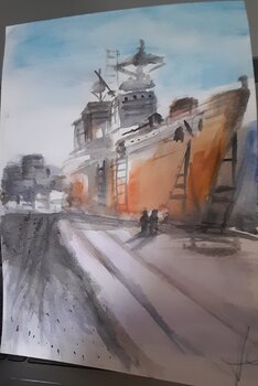 Mit diesem Aquarell wollte ich die Majestät und stille Erwartung eines Schiffes im Hafen einfangen, getaucht in zartes und doch lebendiges Licht. Die Mischung nuancierter Farben drückt den Kontrast zwischen der Festigkeit des Metalls und der Flüchtigkeit von Wasser und Luft aus und vermittelt ein Gefühl von Nostalgie und Ruhe. Ich hoffe, dieses Werk bringt eine ruhige und besinnliche Energie in Ihren Raum.