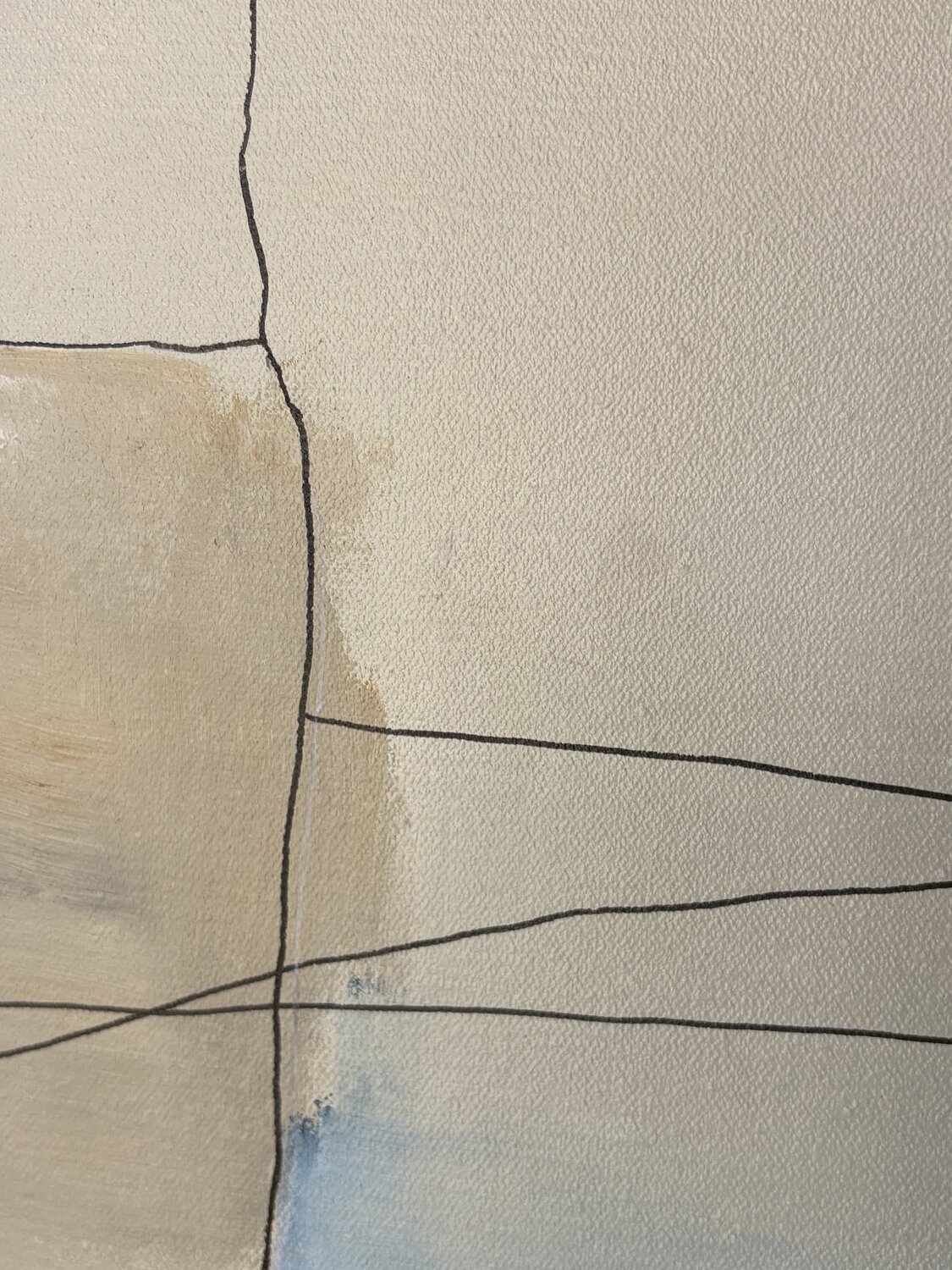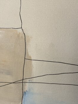 Die Komposition suggeriert einen fragmentierten Horizont, an dem sanfte, atmosphärische Farben auf strukturierte Geometrie treffen. Dünne Linien durchziehen das Gemälde wie Spuren… von Bewegung oder struktureller Spannung und verbinden die einzelnen Bildfelder auf subtile Weise.