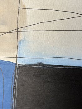Dieses großformatige abstrakte Gemälde erforscht das ruhige Gleichgewicht zwischen Struktur und Offenheit. Horizontale blaue Flächen durchdringen tiefdunkle Formen und filigrane lineare Elemente und erzeugen so einen ruhigen architektonischen Rhythmus auf der Oberfläche.