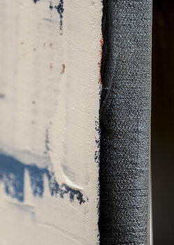 Ein vielschichtiges und interessantes Werk mit vielen Details. Weiss ist die dominierende Farbe blau, gelb und ein rötliches Ocker kommen in verschiedenen Nuancen hinzu. Hergestellt wurde es mit verschiedenen Spachteln und Rakeln.