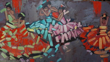 Tanzen. Ballett. Flamenco. Anmutiger weiblicher Körper. Dynamik und Bewegungsrhythmus. Wie übertrage ich dieses Öl mit Pinsel und Spachtel auf Leinwand? Rot, Gelb, Rosa, Blau, Weiß, Lila, Türkis. Der Rhythmus von Farbe und Schatten. Grau und seine Schattierungen im Hintergrund betonen nur die Kraft der Farbe. Perfekte horizontale Komposition. Die Mädchen schienen im Tanz zu frieren. Mädchen tanzen Flamenco. Ideal für ein modernes Interieur