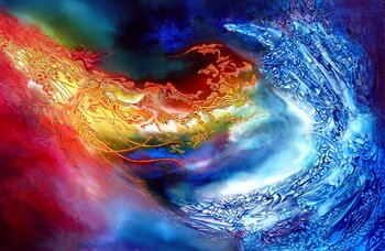 In dieser Arbeit habe ich versucht, den ewigen Kampf zwischen zwei gegensätzlichen Kräften einzufangen. Mit dem Öl habe ich einen Tanz aus leuchtenden Farben geformt, bei dem Feuer und Eis einander gegenüberstehen und sich umarmen. Es ist ein Ausdruck der der Existenz innewohnenden Dualität, einer Koexistenz feuriger Leidenschaften und eisiger Gelassenheit. Es wird dynamische Energie in Ihr Interieur bringen und ein Thema für tiefe Kontemplation…