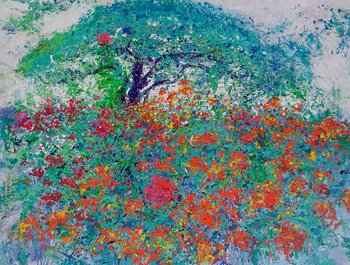 Die Farben sind miteinander gemischt, rot, orange, weiß, rosa Veilchen ... etc. Ich liebe es, stundenlang im Garten zu sitzen und den von… Bäumen umgebenen Garten mit der Zitadelle vor mir zu betrachten. Es ist auf ein Plastiktuch gemalt, das die Farbe heller und subtiler macht, wenn man es durchläuft, getragen von Pinsel oder Spatel, gemischt wie farbige Butter. Die letzten Texturen erzeugen die Blumen, die Dreidimensionalität verleihen.