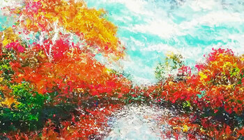 Rote Blätter der Bäume und ihre Reflexionen im Wasser des Flusses. Herbst in Fülle. Die Absicht des Gemäldes ist es, die Bewegung der Landschaft beim Navigieren im Fluss zu vermitteln und eine Verzerrung von Farben und Formen zu erzeugen.