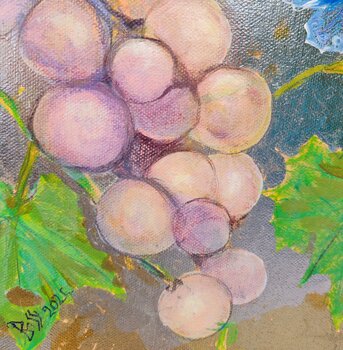 In diesem Werk zelebriere ich das feine Gleichgewicht zwischen der Lebendigkeit der Natur und stillen Momenten. Mit Acryl und Silberblatt schuf ich leuchtende Trauben und zarte Pflanzen, umhüllt von symbolischen Chinoiserie-Mustern. Es strahlt Wärme und sanfte Energie aus und verwandelt jeden Raum in eine Oase der Ruhe, erfüllt von Wachstum, Harmonie und subtilem Glanz – ein Moment, der zwischen den Jahreszeiten und Träumen schwebt.
