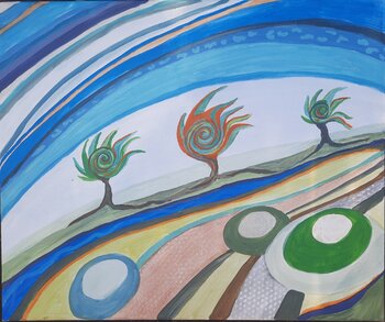 In diesem Gemälde habe ich mit lebendigen Acrylfarben gearbeitet, um eine dynamische und futuristische Landschaft zu erschaffen. Die Bäume, geformt wie wirbelnde Flammen, symbolisieren die unstillbare Lebenskraft und Anpassungsfähigkeit der Natur. Ihre tanzenden Formen gegen die kühnen, fließenden Linien des Himmels und die organisch abstrakten Formen im Vordergrund bringen eine Energie in Ihr Zuhause, die inspiriert und erfrischt.