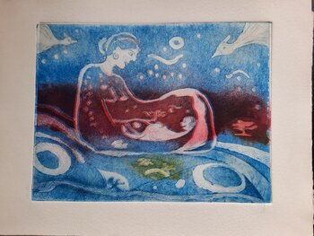 In diesem Werk verkörpert die zarte Verbindung zwischen Mutter und Kind eine universelle Geschichte von Liebe und Geborgenheit. Durch die Gravur ist jede Emotion greifbar, und die warmen Farben strahlen Ruhe aus. Der figurative Stil fängt die Essenz der Menschlichkeit ein. Der eigentliche Druck ist20 cm breit und 15 cm hoch . Farbunikat.