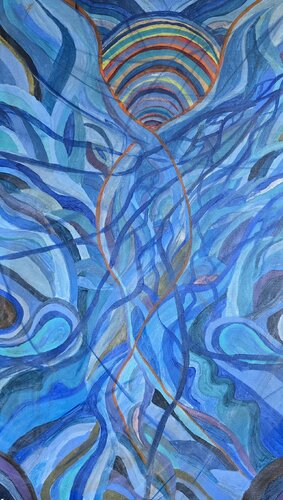 In diesem Werk habe ich mit lebendigen Acrylfarben die fließende Energie von Wasser und Licht eingefangen. Die dynamischen Linien spiegeln Bewegung und Verbindung wider, während die Kombination aus figurativen und abstrakten Formen eine Tiefe zeigt, die zum Träumen einlädt. Es bringt frische Energie und eine beruhigende Atmosphäre in jeden Raum, als ob die Natur selbst dort pulsiert.