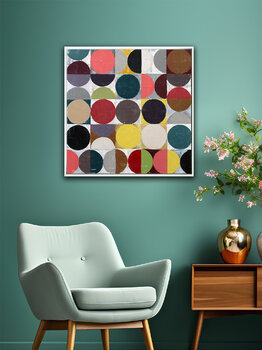 Ein geometrisches Gemälde mit kontrastierenden geometrischen Kugeln im Vintage-Stil. Schweres Acryl sorgt für satte Texturen und starke Kontraste. Es ist ein verspielter Tanz aus Formen und Farben, der jeden Raum aufwertet und belebt und Nostalgie mit einem frischen, modernen Pop-Art-Geist verbindet. Dieses Gemälde strahlt Dynamik und Wärme aus und lädt Sie ein, den Rhythmus der schönen Muster des Lebens jeden Tag zu spüren.