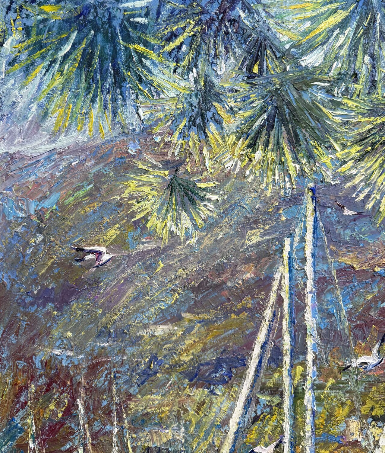 „Atem der Freiheit“ fängt den ruhigen Hafen von Biarritz ein, wo Segelboote unter dem Flüstern der Kiefern ruhen und das Sonnenlicht auf dem Wasser tanzt. Jeder Impasto-Strich spiegelt den Rhythmus der Meeresbrise wider – ein Moment der Ruhe, Freiheit und Harmonie. Diese lebendige Meereslandschaft feiert die grenzenlose Seele des Ozeans und die Freude am offenen Horizont.