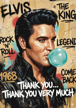 Ein ikonisches und ausdrucksstarkes Porträt, das Elvis Presley in der Sprache der zeitgenössischen Pop-Art neu interpretiert. Das Gesicht des „King“ erscheint mit charismatischer und zugleich faszinierender Intensität – ein Symbol für Ruhm, Rebellion und den Mythos der Popkultur. Der vielschichtige Hintergrund, durchzogen von Wörtern und grafischen Elementen, erinnert an die Bildsprache des Rock ’n’ Roll und die Energie einer Ära, die die Massenkultur… revolutionierte.