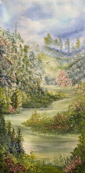Dieses Acrylbild entstand in ruhiger Stimmung. Ich verband Impressionismus mit orientalischen Einflüssen, um eine beschauliche Reise durch die Natur einzufangen. Der sich schlängelnde Fluss lädt zum Verweilen und Entspannen ein, während sanfte Farbtöne und zarte Pinselstriche eine friedvolle, meditative Atmosphäre schaffen.