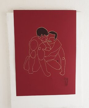 In meinem Kunstwerk verwende ich Bleistift, Filz und Indische Tinte, um die Intensität und Emotionalität des Ringkampfes darzustellen. Diese Zeichnung spiegelt die dynamischen Bewegungen und die körperliche Interaktion der Figuren in einem fast abstrakten Stil wider. Auf dem kräftigen roten Hintergrund heben sich die Kämpfer hervor, symbolisch für Leidenschaft und Kampfgeist. Diese Schöpfung spricht von menschlicher Kraft und Verbindung und bringt… eine lebendige sowie nachdenkliche Energie in jedes Zuhause.