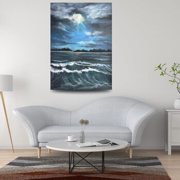 Dieses Gemälde fängt den Zauber des nächtlichen Meeres ein, erleuchtet vom mystischen Schein des Mondes. Die Wellen, beinahe lebendig, strahlen Kraft und unendliche Tiefe aus, während das durch die Wolken brechende Licht eine Atmosphäre von Geheimnis und Hoffnung schafft. Dieses Werk lässt den Betrachter den Atem der Natur spüren – ihre Wildheit und zugleich ihre wohltuende Präsenz.