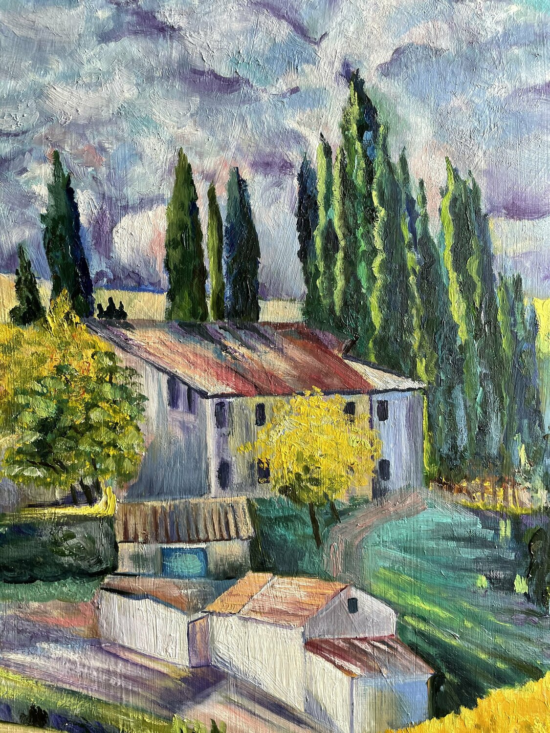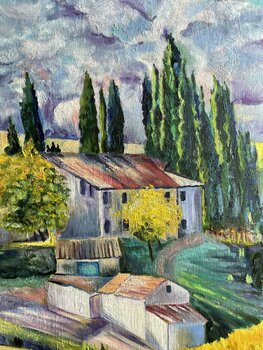 Ein Gemälde über einen der malerischsten Orte Italiens, die Toskana. Ich habe in der Technik der pastösen Malerei gemalt, zeigte Volumen, unglaubliche Farbwiedergabe. Das Gemälde zeigt einen Bauernhof, umgeben von verschiedenen Bäumen, Zypressen. Ein Märchengemälde, ein Traumgemälde, es ist wirklich sehr ungewöhnlich und farbenfroh geworden. Das Gemälde wird in jedem Interieur Ihres Zuhauses großartig aussehen.