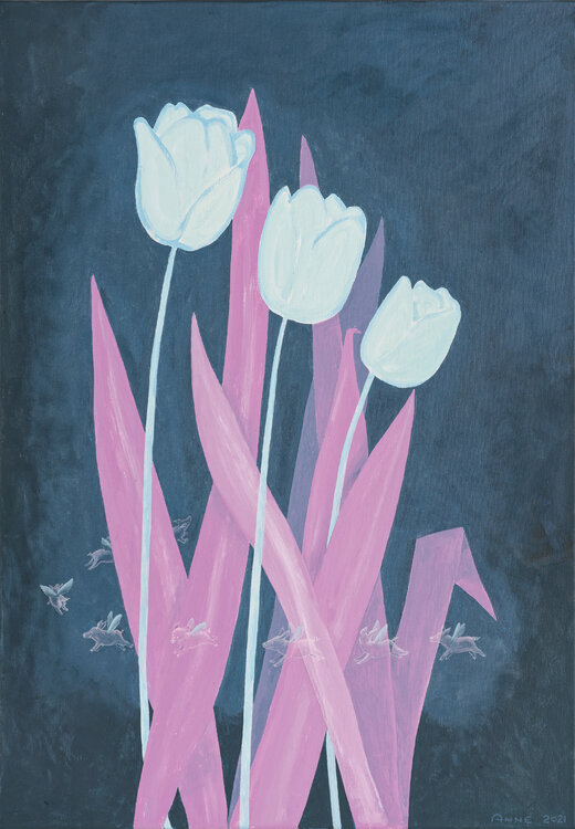 In diesem Werk habe ich mit leuchtendem Acrylfarben-Expressionismus eine surreale Welt geschaffen, in der weiße Tulpen und pinke Blätter symbolisch für Reinheit und Energie stehen. Die Schweinchen mit den Elfenflügeln verstärken augenzwinkernd das Gefühl von Leichtigkeit und Hoffnung. Diese Malerei bringt frischen Schwung und eine poetische, fast magische Stimmung in jeden Raum.