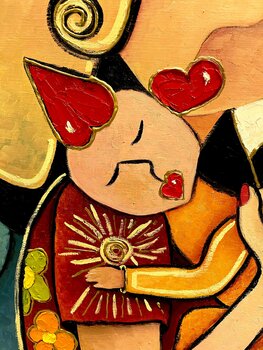 Dieses Ölgemälde liegt mir besonders am Herzen, denn es verkörpert die Zärtlichkeit und Hoffnung, die die Unschuld eines Kindes in diese Welt bringen kann. Ich wollte symbolische Elemente hinzufügen, um diese Arbeit zu bereichern. Wir bemerken zum Beispiel eine Spielkarte mit einem roten Herzen in der Nähe des Kopfes einer der Figuren. Dieses Herz, ein Symbol der reinen Liebe, verstärkt das zentrale… Thema des Gemäldes. Obwohl die Augen der Charaktere stilisiert sind, strahlen sie eine emotionale Tiefe aus, die eine aufrichtige und liebevolle Verbindung vermittelt.