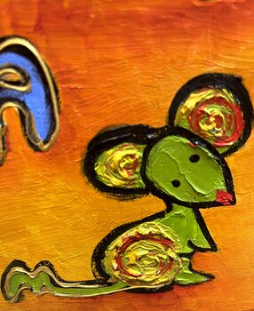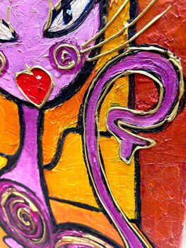 In dieser Arbeit habe ich Naivität und Kubismus verschmolzen, um ein skurriles Zusammenleben darzustellen, in dem feurige Farben auf kräftige Formen treffen. Als Einladung zur Harmonie offenbart jeder Ölstrich eine freudige Kakophonie, die an ein Zuhause voller positiver Energie und friedlichen Zusammenlebens erinnert.