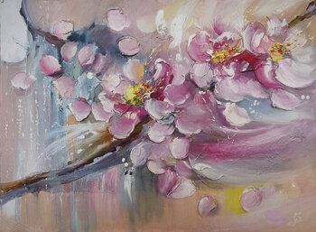 Elegant Textured Floral Oil Painting with Subtle Shimmer and Decorative Beads – Original Magnolia-Inspired Wall Art, Soft Neutral Palette
