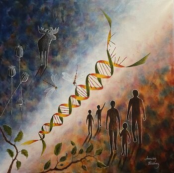 Dieses Gemälde pulsiert vor der Energie des Lebensgeheimnisses und fängt das Zusammenspiel von Natur, Evolution und menschlicher Existenz ein. Mit Acrylfarben verschmolz ich surreale und symbolische Elemente, um Sie auf eine Reise von den Wurzeln zum Wesen des Seins mitzunehmen, symbolisiert durch den DNA-Strang. Es verströmt eine lebendige Dynamik, die Ihr Zuhause mit Staunen erfüllt und zur Reflexion über unseren gemeinsamen Weg und unser Wachstum… einlädt.