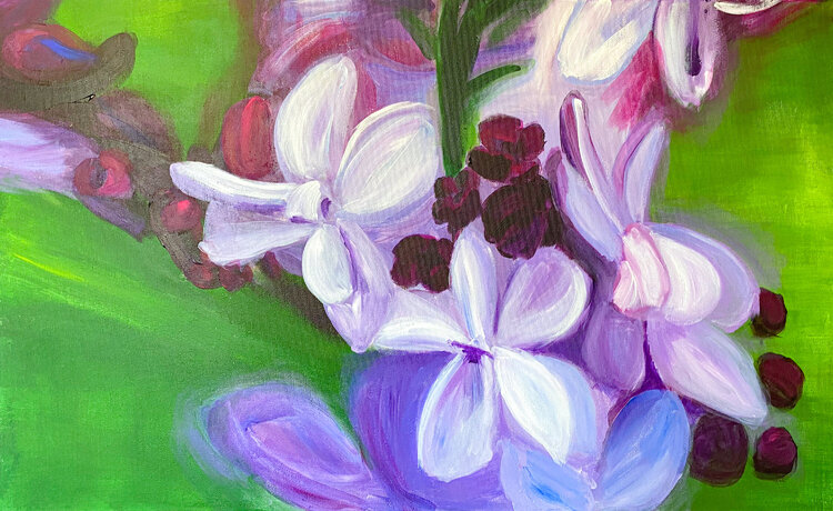 Die Dunklen Knospen heben sich deutlich von den Fliederfarbenen Blüten ab. Durch die starke Vergrößerung einzelner Blüten wirkt das Bild fast abstrakt. Die Farbe wurde in mehreren Schichten mit Pinsel aufgetragen.