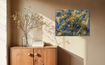 In diesem abstrakten Acrylbild wollte ich die rohe Energie der Natur in Bewegung einfangen und tiefe Blautöne mit leuchtenden Goldstrahlen vermischen. Jeder Pinselstrich drückt eine intensive Emotion aus, einen Tanz zwischen Ruhe und Sturm. Es verleiht Ihrem Raum eine lebendige, geheimnisvolle Atmosphäre voller Kraft und Harmonie. Wir sind alle bereit, uns neuen Horizonten zuzuwenden …
