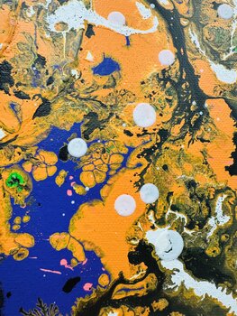 Tageslichtphase: Ein energiegeladenes, zeitgenössisches Meisterwerk. Kräftige Farbtupfer in Orange, Lila und Tiefschwarz formen einen dynamischen, abstrakten Baum. Seine reichen Texturen und die lebendige Farbpalette machen ihn zu einem kraftvollen Blickfang in jedem modernen Interieur.