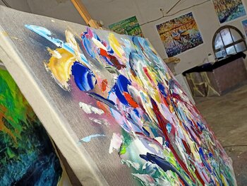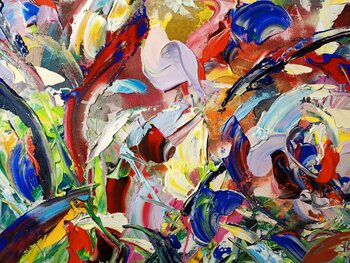 Dann gibt es dennoch eine Lösung, denn der Künstler arbeitet auch auf Kommission. Er kann stilistische Elemente, die Ihnen gefallen, in einem für Sie kreierten Werk einfließen lassen. Sie können dabei die Dimensionen bestimmen und wir verhandeln den Preis für Sie.